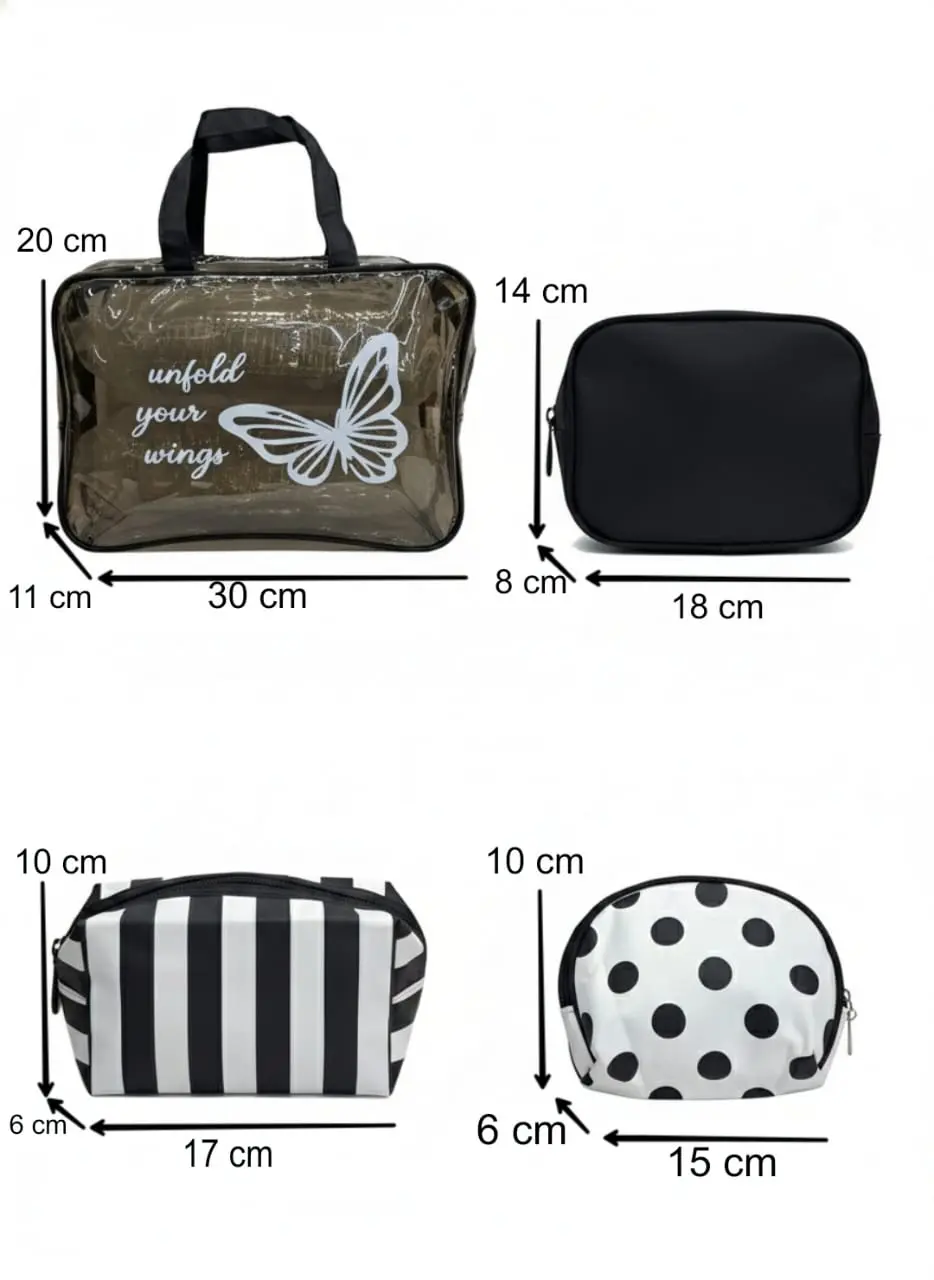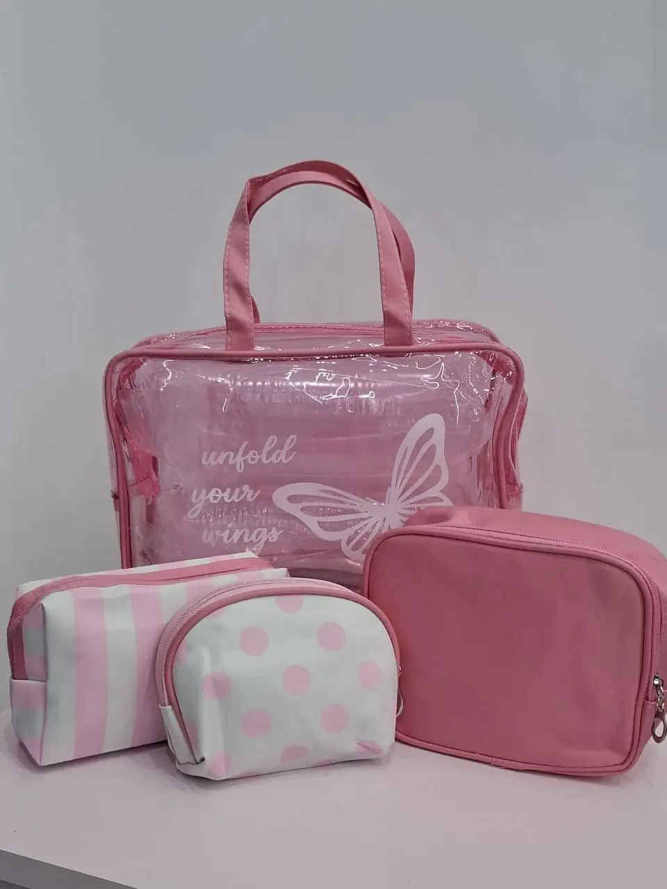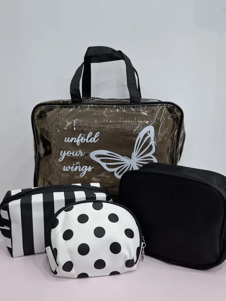 El Set Incluye: 1 Bolso grande con manijas + 3 Neceres internos con diseños (rayas, lunares y liso).