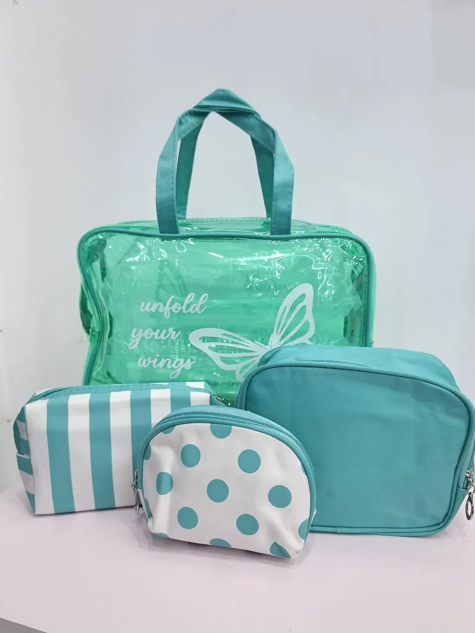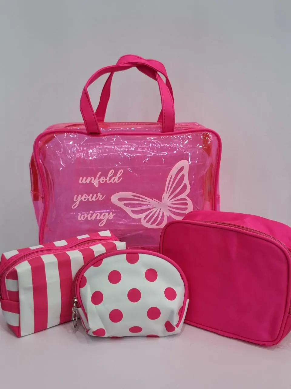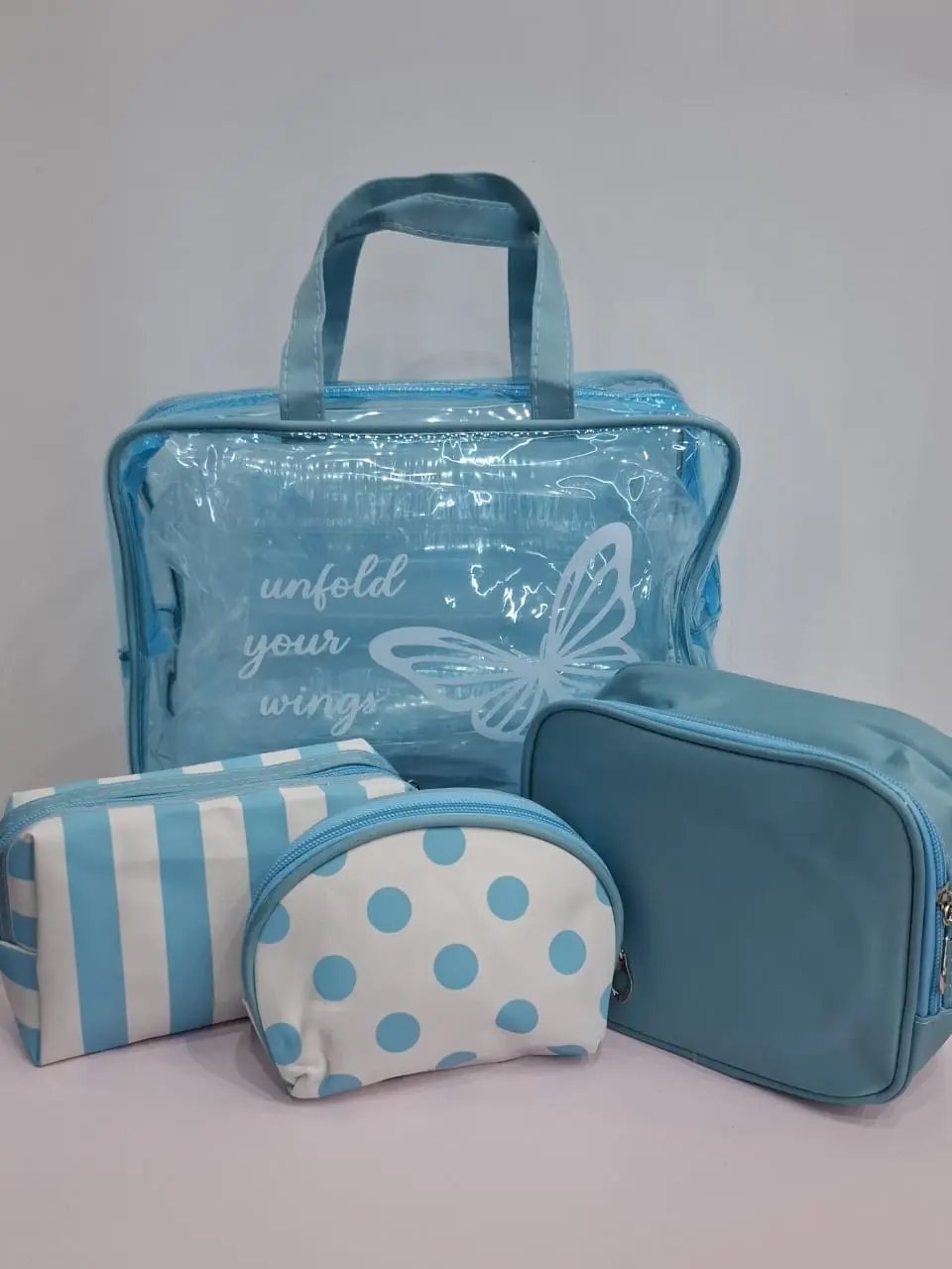 El Set Incluye: 1 Bolso grande con manijas + 3 Neceres internos con diseños (rayas, lunares y liso).