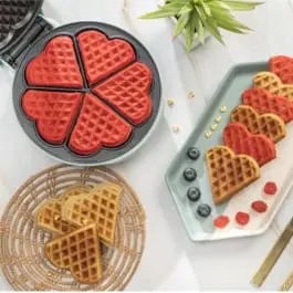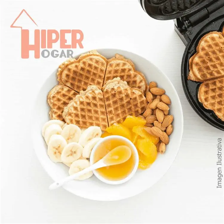 Maquina para hacer wafles en forma de corazon, waflera electrica.Potencia : 700 wDiametro : 18.5 cmSalen 5 porciones de mini wafles en forma de corazón.1 Wafle Largo de donde surgen 5 mini wafles en forma de corazón.Fácil de limpiar